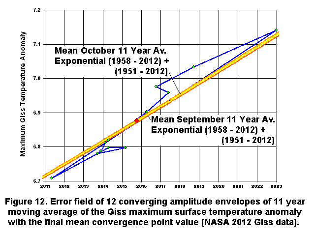 Figure 11 shows the error field of the 12 intersection points of the converging amplitude envelopes of the monthly 11 year moving average of the Giss maximum surface temperature anomalies (NASA 2012, Giss data). The two most extreme end points, July (2011.363; temperature anomaly 6.7079 degrees C) and June (2022.989; temperature anomaly 7.1414 degrees C) allow a global maximum surface temperature gradient to be estimated of 0.03728 degrees C per year.
